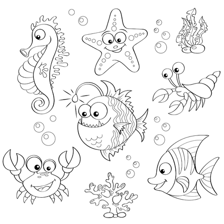 かわいい漫画の海の動物のセットです 塗り絵の黒と白のイラスト のイラスト素材 ベクタ Image