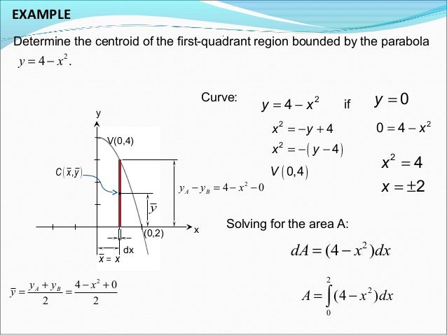 Answer (1 of 4) First, you have to find the area under the graph For the center of gravity in the Y direction, you divide the area by the difference of the limits of integration, which in this case is 100 minus But you still have to find the center of gravity in the X direction You have to. This engineering statics tutorial goes over how to find the centroid of the area under a parabola It requires a simple integrationIf you found this video h. Since the parabola is in the form $x^2 = 4ay$ where $a=9$, I deduced that the vertices of the triangle will be $A(9t_1^2,18t_1)$, $B(9t_2^2,18t_2)$ and $C(9t_3^3,18t_3)$ The $x$ and $y$ coordinates of centroid $h$ and $k$ will thus be given by the sum of coordinates of the vertices $h = 6(t_1t_2t_3)$ and $y = 3(t_1^2t_2^2t_3^2)$.