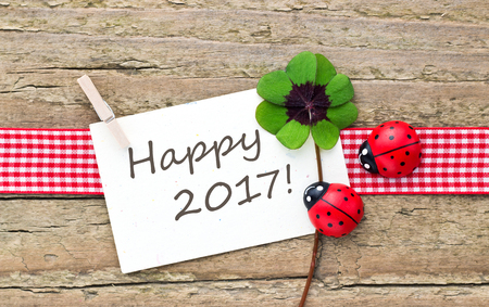 葉のクローバーとてんとう虫の英語の年賀状 の写真素材 画像素材 Image