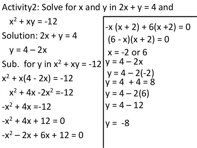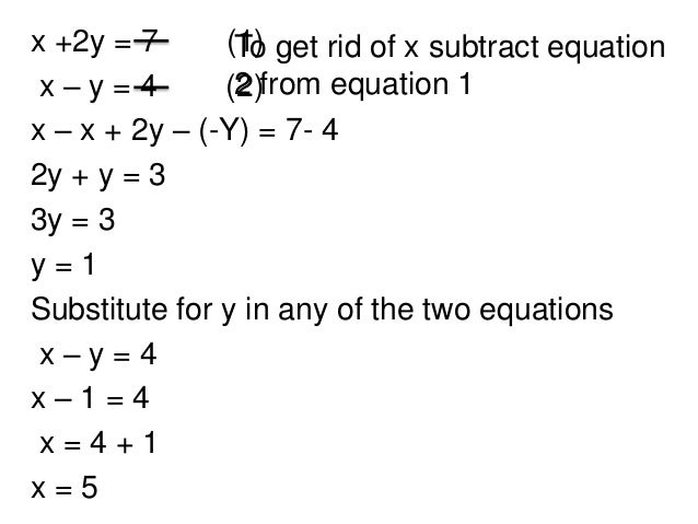 2x =4 Solve, divideby2 2 2 x =2 Wenowhavex!. Simultaneous linear equations in two variables involve two unknown quantities to represent reallife problems It helps in establishing a relationship between quantities, prices, speed, time, distance, etc results in a better understanding of the problems We all use simultaneous linear equations in our daily life without knowing it. X^2y=5,\x^2y^2=7 xyx4y=11,\xyx4y=4 3x^2=y,\x1=y xy=10,\2xy=1 substitution\x2y=2x5,\xy=3 elimination\x2y=2x5,\x.