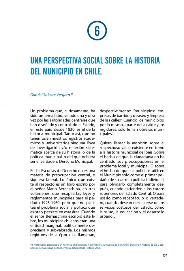 Gabriel Salazar Vergara (born 31 January 1936) is a Chilean historianHe is known in his country for his study of social history and interpretations of social movements, particularly the recent student protests of 06 and 11–12 Salazar was born into a lower class family, he studied history, sociology and philosophy at Universidad de Chile, and for time he was assistant of. GABRIEL SALAZAR VERGARA Esta colección de ensayos del premio nacional de historia 06 viene a dar cuenta del progreso intelectual que ha tenido Gabriel Salazar a lo largo de los últimos treinta y cinco años de escritura sobre la historia y el sentido de su oficio Gabriel Salazar ha sido durante los últimos treinta años uno de los más relevantes e imprescindibles expositores de la. B 1936 in Santiago Chile) found Golpe, volume 1, cover (Gabriel Salazar) page 302 (historian;.