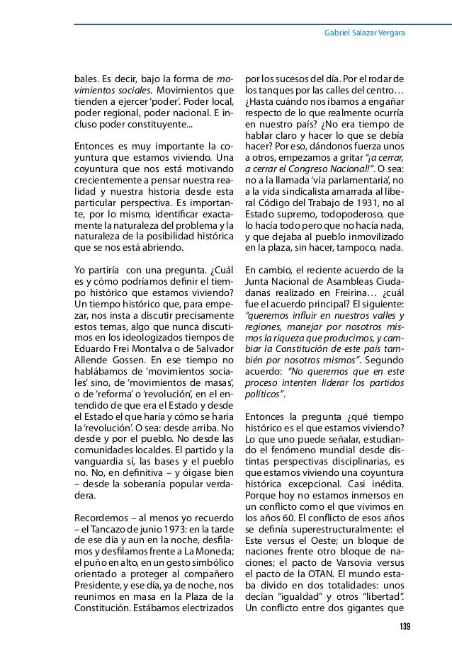Gabriel Salazar Vergara (Santiago, 31 January 1936) is a Chilean historian He is known in Chile for his study of social history and interpretations of social movements, particularly the recent student protests of 06 and 11–12 Property Value;. Usage Gabriel Salazar V) found Memorias de un peóngañán, , 08 tp (Gabriel Salazar V) cover front flap (Gabriel Salazar;. Profesor guía Gabriel Salazar VergaraSantiago de Chile, diciembre de 172 Agradecimientos En primer lugar agradezco a mi familia A mi madre, Erika, la más revolucionaria de todas, por comprender y transmitirme el sentido solidario, empático y humanizador de la vida Sin su inmenso e inagotable cariño, dedicación, esfuerzo y amor nada de esto hubiera sido posible Para mi.