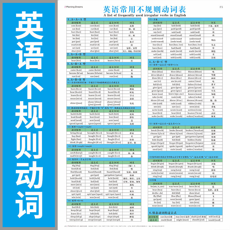 英語不規則動詞表小學初中高中十六種時態表語法專項練習牆貼掛圖