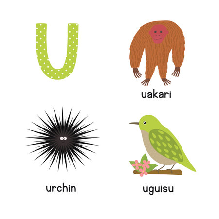 ベクトルのかわいい動物園アルファベット U 文字 面白い漫画の動物 ウニ Uakari ウグイス カラフルなスタイルのアルファベットのデザイン のイラスト素材 ベクタ Image